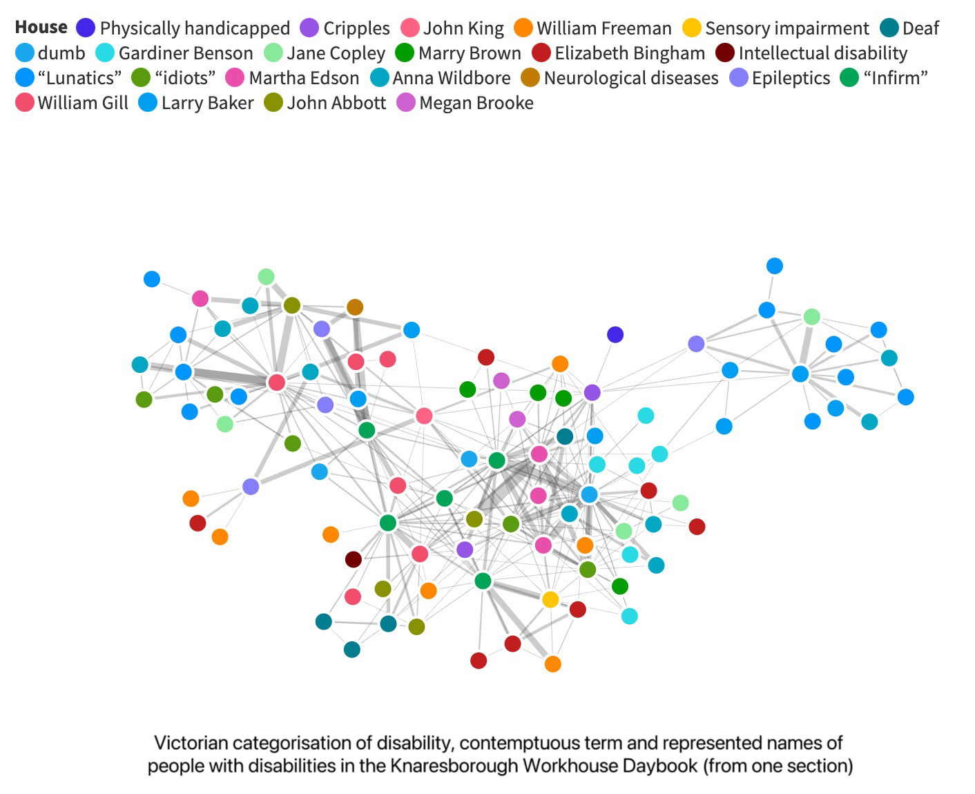 A wide range of disabilities existed in the Victorian era, from physical impairments to sensory, intellectual and neurological disorders. Many of these disabilities were caused by the harsh living and working conditions of the Industrial Revolution. It is worth noting that the term 'disability' was not used until recently and much of the language used in the Victorian era now seems offensive. The networked graph presents the Victorian social categorisation of disability groups and the practice of this categorisation model by the Poorhouse as the authoritative admission institution of the time. Each disability category was given a different contemptuous term, and they were interrelated and intertwined. We took a chapter from the Knaresborough Workhouse Daybook on the long-term inmates and found that they were categorized into different disability categories and contemptuous terms. The contemptuous terms reflect the stigmatization of individuals with disabilities at the time of the workhouse, and especially in British society, where capitalism was developing at a rapid rate. Multiple stigmatizations may be given to the same disabled individual, and multiple disabled individuals may in turn be stigmatized in the same label. A logic of internalized stigmatization of disabled individuals may arise in this situation: disabled individuals themselves imply labeled prejudice, and prejudice can also refer to disabled individuals. This graphic aims to illustrate that the social stigma of disability contains stereotypes, prejudices and strong exclusions, revealing the systemic logic of social norms and institutions that oppress persons with disabilities.