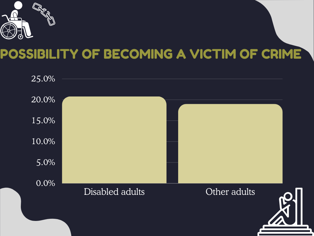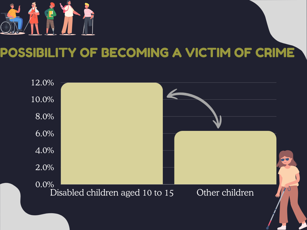 Disabled people are more than 3 times more likely than non-disabled people to often or always feel lonely, with wellbeing rates for disabled people consistently lower than for non-disabled people. Disabled people more often indicated that the impact of the pandemic had affected their well-being more than non-disabled people. The disparity in wellbeing and loneliness between disabled and non-disabled people has not improved since 2013 to 2014. When it comes to basic rights like the right to be safe from harm, disabled people are disproportionately affected by crime. Disabled adults are more likely to be victims of crime (20.8%) than other adults (19.0%), and disabled children aged 10 to 15 (12.0%) are almost twice as likely to be victims of crime than other children (6.3%).