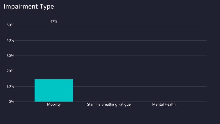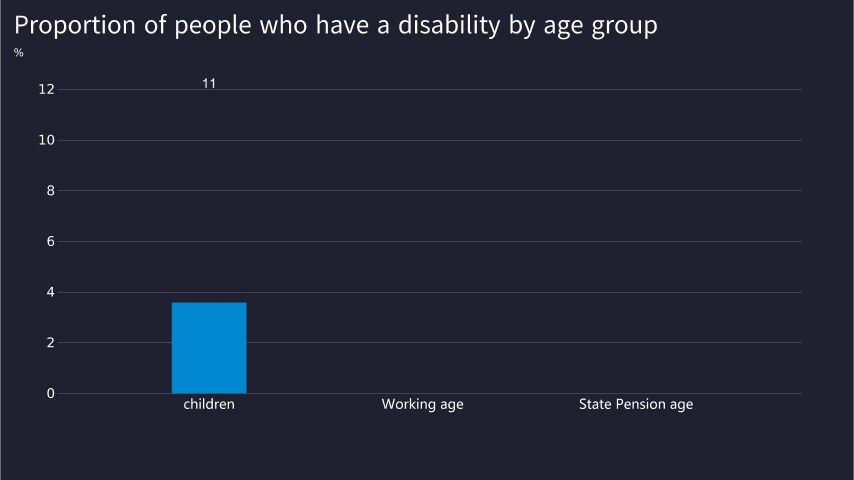 An estimated 16.0 million people in the UK had a disability in 2021/22. This represents 24% of the total population. The prevalence of disability rises with age: around 11% of children were disabled, compared with 23% of working age adults and 45% of adults over State Pension age. Mobility is the most frequently reported impairment type (47%), followed by stamina, breathing or fatigue (35%), and mental health(32%).