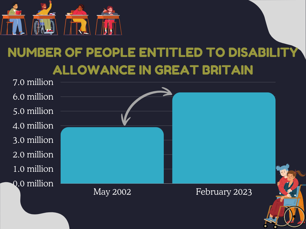 Over time, the number of individuals entitled to receive disability benefits in the UK has been steadily increasing. The number of disability benefit cases can indicate the trend in the prevalence of disabilities. It has risen from 3.9 million people (6.8% of the total population) in May 2002 to 6.3 million people (9.6% of the total population) by February 2023.