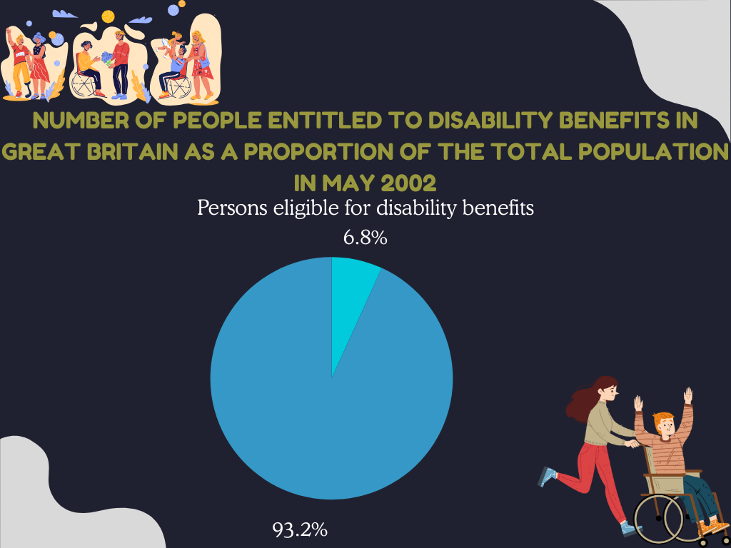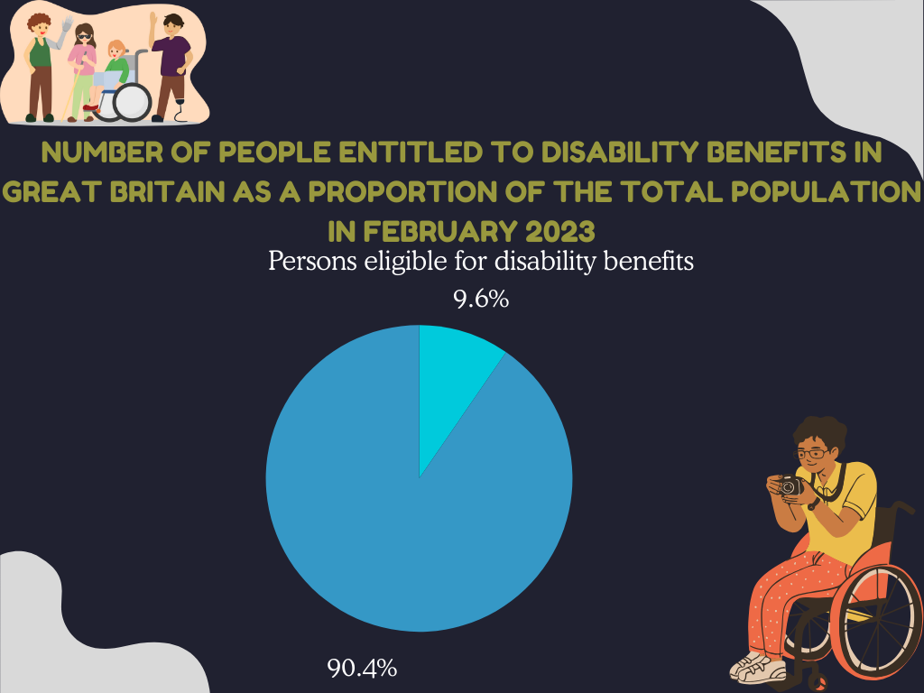 As depicted in the graph, disability population statistics provide us with the foundation for assessing societal inclusivity and equality.Although it is important to note that not every person who is considered disabled under the Equality Act claims or qualifies for a disability benefit. Although the UK has a wide-ranging disability benefits system, only 9.6% of the total population claims extra-cost benefits, which may point to problems of benefit accessibility or difficulties in identifying disability.
