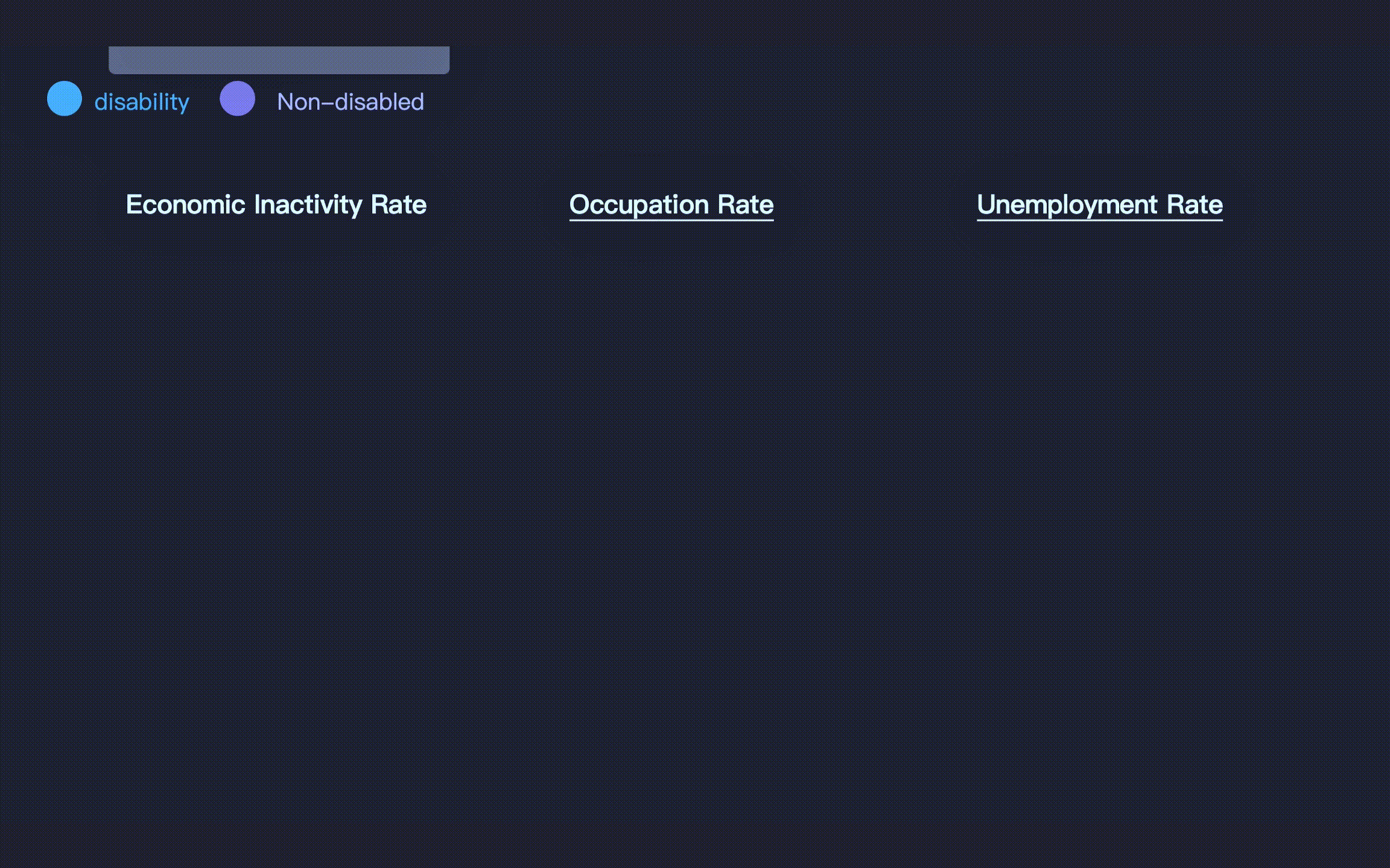 Key labor market statistics for the period January-March 2023 for disabled and non-disabled people aged 16-64 in the UK. As can be seen from the chart: the employment rate for disabled people (53.7%) is significantly lower than for non-disabled people (82.7%).