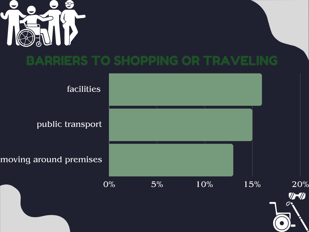 2 in 5 disabled people had experienced difficulties shopping around for products or services, with reported barriers including a lack of appropriate facilities (16%), difficulty using public transport (15%), and difficulty moving around premises (13%).